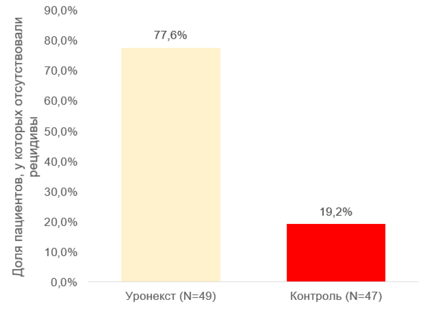 - для пациентов с рецидивирующими инфекциями мочевыводящих путей: комплексное применение с антибиотиками способствует увеличению безрецидивного периода (активные компоненты продукта Уронекст® снижают число обострений в 4 раза).19